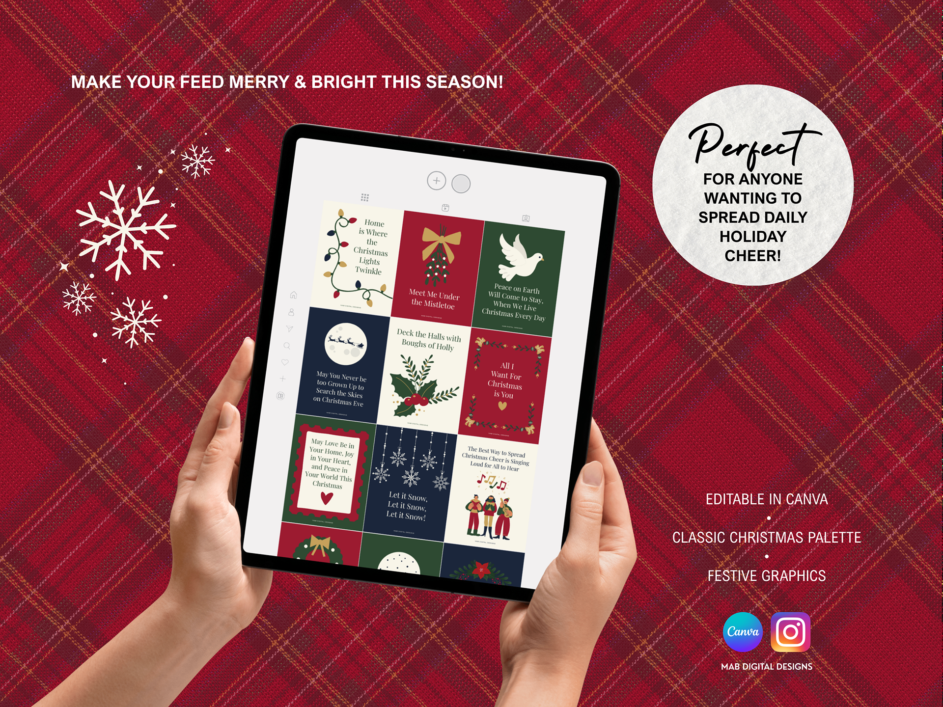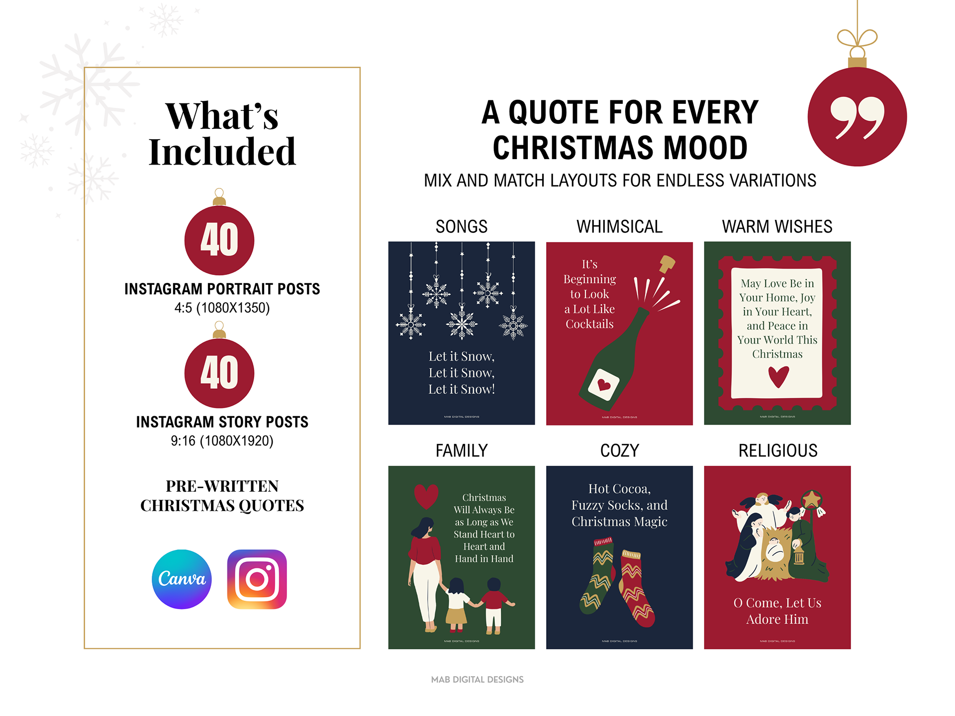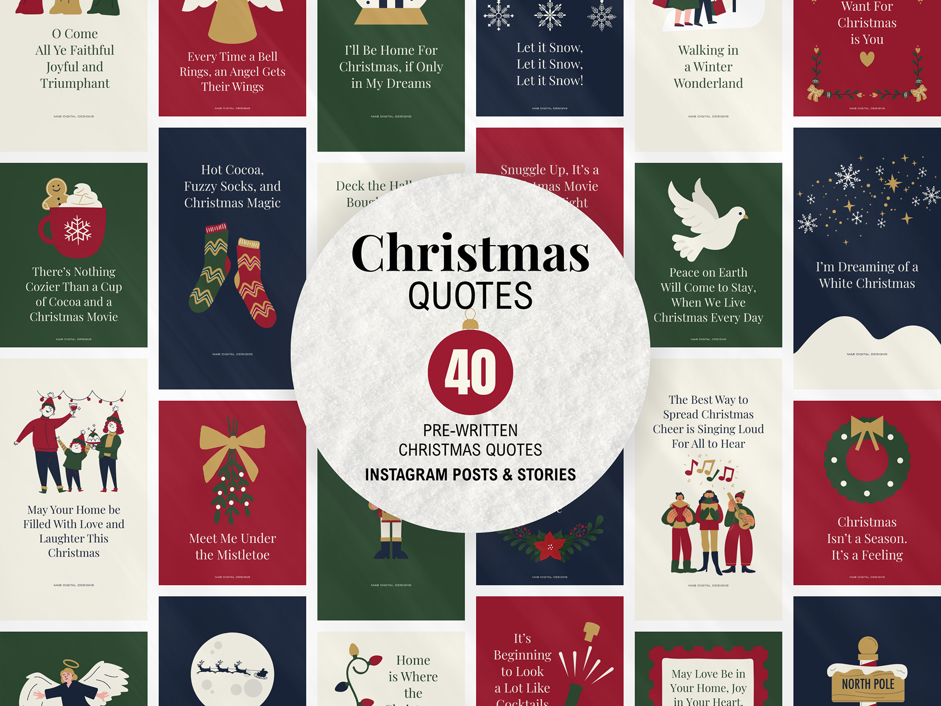 Bring the warmth and nostalgia of the holiday season to your Instagram feed with this Christmas Quote Canva Template Set. designed in traditional Christmas colors of Deep Crimson, Evergreen, Antique Gold, Cream Linen, and Midnight Blue. Perfect for wellness brands, creators, and small businesses who want to share heartwarming holiday messages with a timeless, classic look. This Christmas Quotes Canva Template is available for purchase on Etsy as an instant digital download